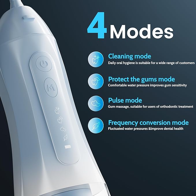 - Personalized and Effective Cleaning: Our flosser for teeth cleaning and flossing offers 4 cleaning modes, provide a personalized experience for users of all ages. Whether you need a gentle clean for sensitive gums or a powerful pulse for deep cleaning, our water flosser has you covered. The multiple tips included cater to various dental care needs, ensuring a thorough and effective clean every time