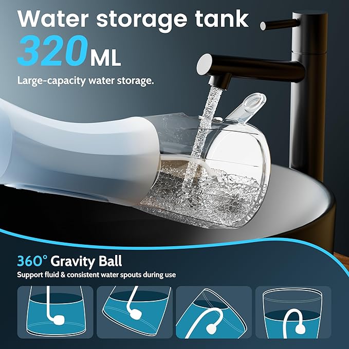 - Convenient and Easy to Use: Equipped with an 320 ml extra-large water tank, our water flosser for teeth allows for uninterrupted cleaning without the need for frequent refills. The wide-mouth design makes filling and cleaning the tank quick and easy. With an IPX7 waterproof rating, you can safely use it in the shower. The ergonomic handle and multiple interchangeable tips ensure a comfortable grip and versatile use
