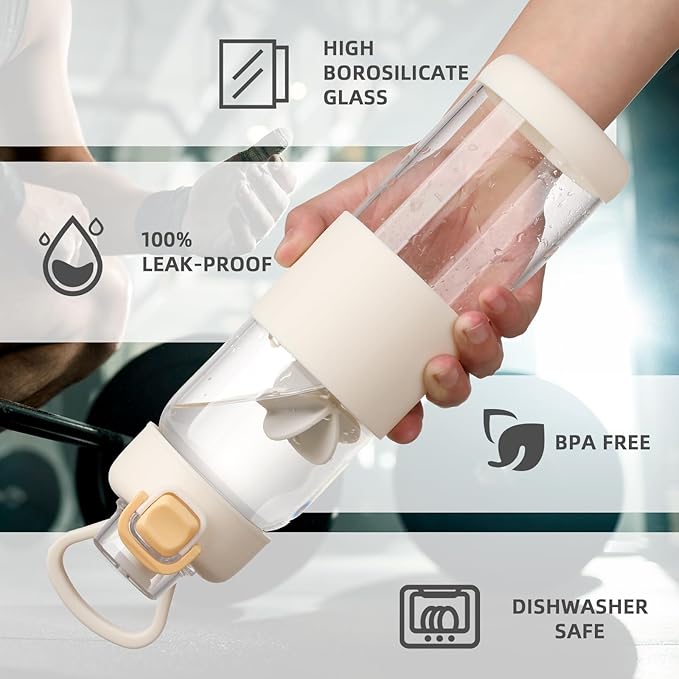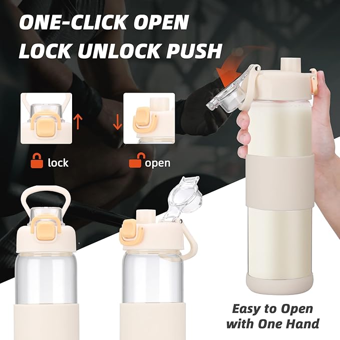 - LEAK-PROOF:The 24 oz glass shaker bottle featured with one touch flip lid makes it easy to pop and drink directly from the glass. The lid engineered to ensure a leak-proof seal, providing you with peace of mind wherever you go
