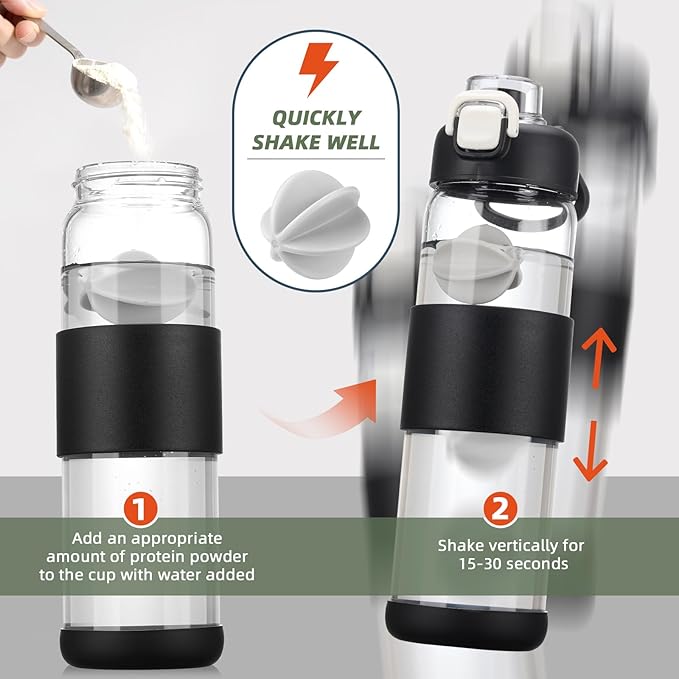 - LEAK-PROOF:The 24 oz glass shaker bottle featured with one touch flip lid makes it easy to pop and drink directly from the glass. The lid engineered to ensure a leak-proof seal, providing you with peace of mind wherever you go
