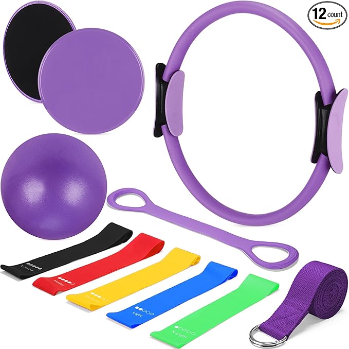 - 6 Exercise Sets: unleash your fitness potential with our comprehensive 6-set Pilates kit! Featuring a 14-inch fitness ring, a 9-inch ball, a 71-inch yoga strap, silicone tension strip, a 5-piece resistance band set, and a pair of sliding discs, these expertly curated essentials cater to both beginners and seasoned practitioners; Elevate your workout routine with these tool, tools designed to enhance your Pilates practice and take your fitness journey to the next level