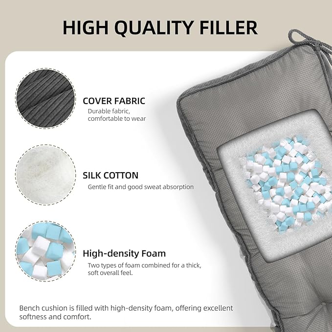 - Foam material: The tufted bench cushion is made up of high resilience foam and silk cotton material, which is thick and soft, naturally fits the body curves and relieves fatigue.