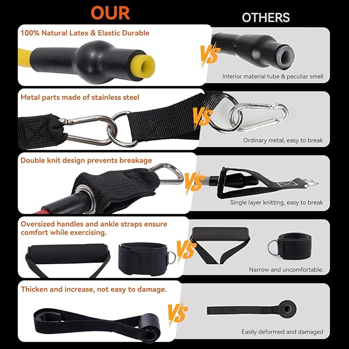 - Versatile Exercise Kit: This exercise kit, with handles and ankle straps, includes 11 pieces that integrate seamlessly into any home gym set. The elastic tubes are perfect for pilates, yoga, and physical therapy, enabling stretching and extensive workouts for a slim physique.