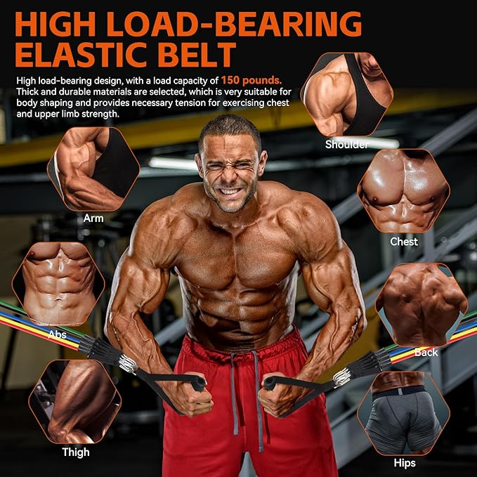 - High Weight Resistance Bands: Designed with high weight tolerance, resistance bands offer a 150lb capacity. Featuring thick, the materials, these bands are ideal for full body shaping, providing the necessary tension for exercises that build chest and upper body strength.