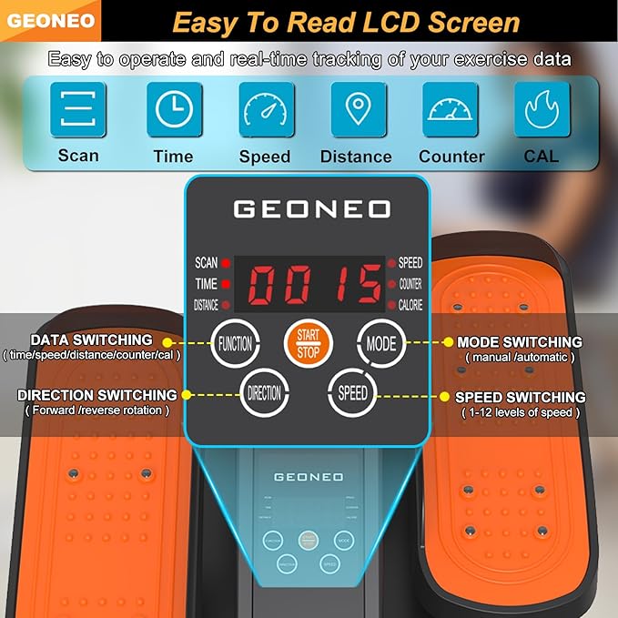 - 【Auto and manual dual modes】 The elliptical leg machine has (HR) manual (support 12 speed adjustment) and automatic (P1-P2-P3 three preset modes) two modes for you to choose. Adjust the speed to achieve the workout you need, while the pedal rotation direction can be forward or backward to target different muscle groups