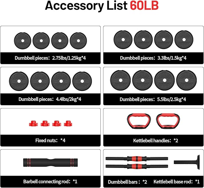 - WEIGHT PACKAGE LIST - 60 lbs fitness dumbbells include: 4 × 5.5lbs weight plates,4 × 4.4lbs weight plates, 4 x 3.3lbs weight plates,4 × 2.75lbs weight plates,4x dumbbell nuts,2 × kettlebell handles, 1 × barbell connecting rod ,1 × kettlebell base rod and 2x dumbbell bars. You can choose different weights according to your own preferences to meet the intensity needs of you and your family at different stages of exercise