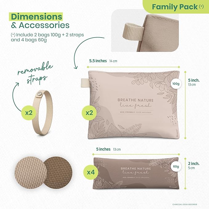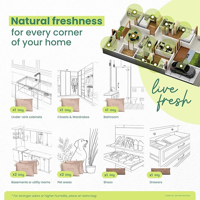 - NATURAL ODOR ABSORPTION TECHNOLOGY: – Harness the power of bamboo charcoal bags to naturally purify your living spaces. This advanced odor absorber targets moisture and bad smells at the source—perfect for closets, cars, bathrooms, shoe racks, cat litter boxes, cabinets, and even the basement.