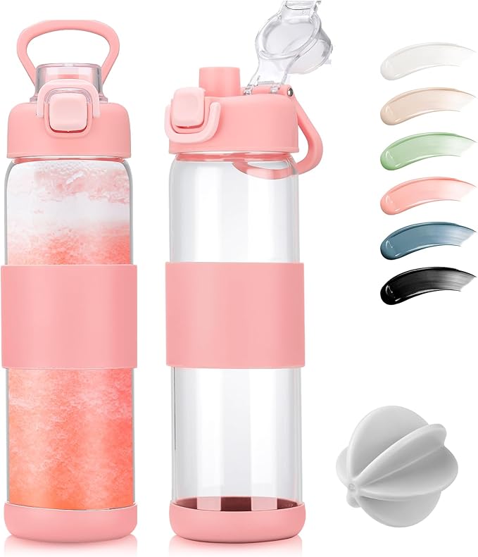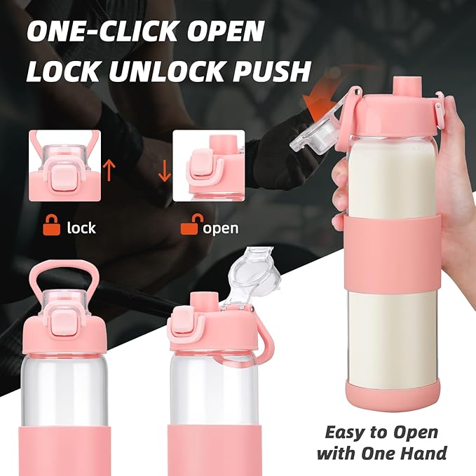 - LEAK-PROOF:The 24 oz glass shaker bottle featured with one touch flip lid makes it easy to pop and drink directly from the glass. The lid engineered to ensure a leak-proof seal, providing you with peace of mind wherever you go