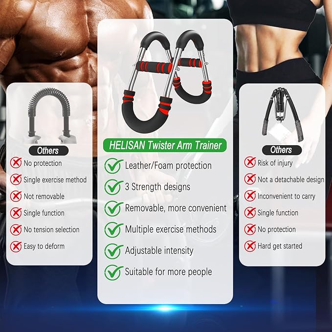 - ðãUPGRADED SPRINGS: 60-110lbãHELISAN Twister arm trainer has 3 adjustable intensity levels, so it's perfect for users at different fitness levels. Whether you are a beginner or experienced fitness enthusiast, you can easily change the resistance to match your own situation and make a personal training plan to help you reach your fitness goals