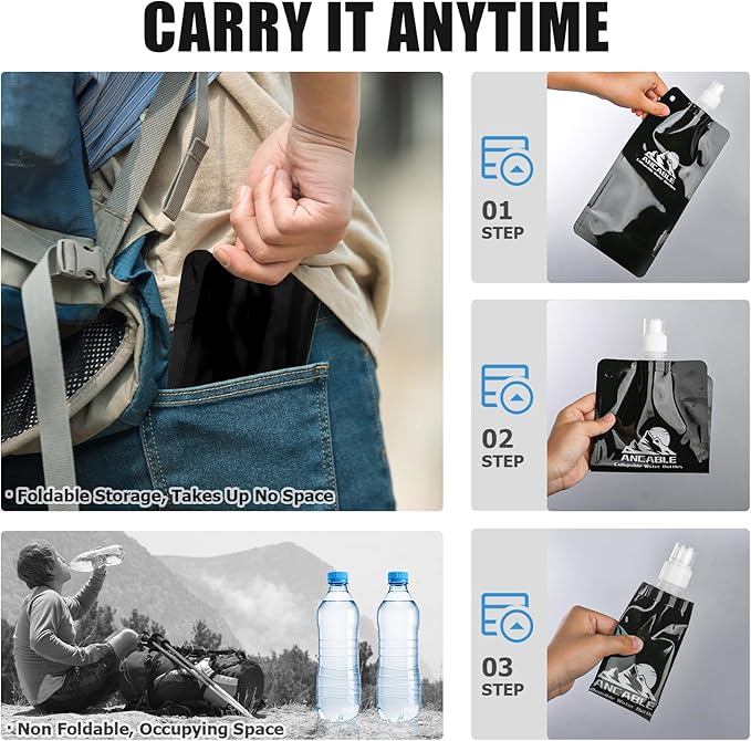 - Hiking Water Bottle: 3-Pack Water Bottle, Each capacity is 0.5L (17OZ), and the bottle mouth is equipped with a 28mm thread that can be connected to any portable water filter. The folding water bottle can be used multiple times, and its lightweight size and volume are very suitable for various outdoor scenarios such as outdoor travel, camping, hiking, mountaineering, etc.
