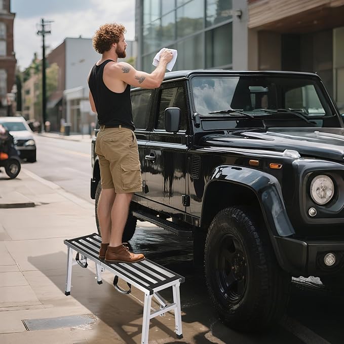 - Three levels of height adjustment: the height of this adjustable work platform can be adjusted to 19/23/27 in three different heights each support leg can be adjusted individually to adapt to different terrain versatility makes it can be used in a variety of application scenarios, such as car washing, wall painting, window cleaning, home decorating, height building construction.