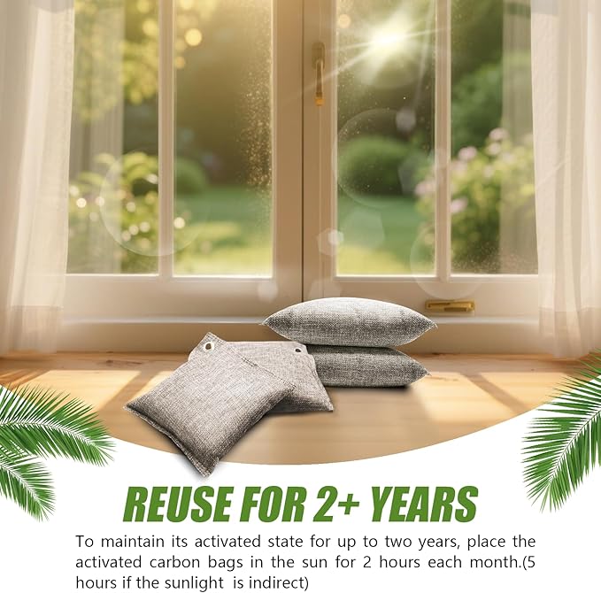 - Reusable for 2 years: Refresh your home's air for 2 years with our rechargeable charcoal deodorizer bags odor elimination, just sunbathe monthly. Perfect for bedrooms, drawers, and more. Eco-friendly & cost-effective