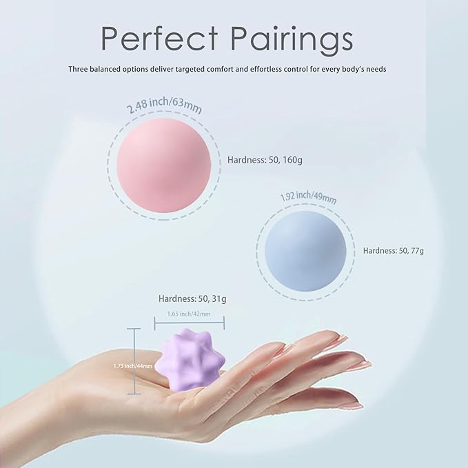 - 【Multi-Size Trigger Point Targeting】 Strategic sizing adapts to muscle zones:63mm: Broad areas (back/thighs);49mm: Mid-zones (Back/ Neck/Shoulders);42mm textured ball: Focused trigger points(hands/feet)The smooth balls glide seamlessly across large muscle groups while the mini ball precisely targets specific areas for self-applied muscle release, helping ease stiffness and tension through focused pressure application. This set serves as a versatile tool for daily muscle care routines