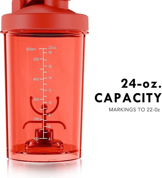 - Portable & Large Capacity: 24oz (700ml) shaker with built-in carrying hook makes it easy to take anywhere. Perfect for mixing up to 3 scoops of powder and 16oz of liquid without spills.