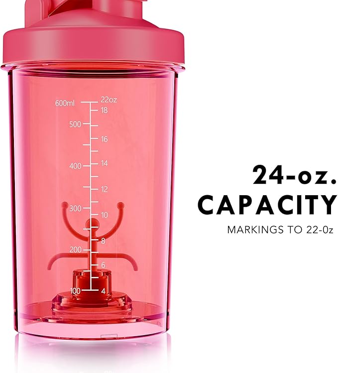 - Portable & Large Capacity: 24oz (700ml) shaker with built-in carrying hook makes it easy to take anywhere. Perfect for mixing up to 3 scoops of powder and 16oz of liquid without spills.