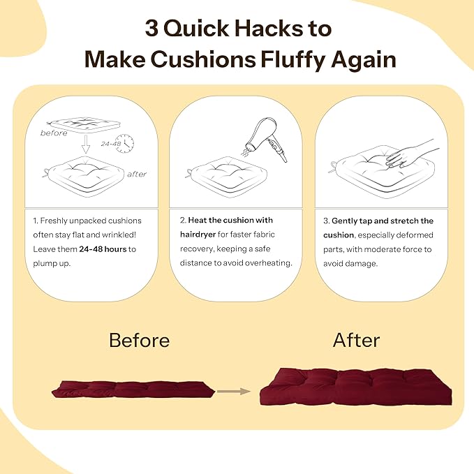 - Gentle reminder: Upon opening the package, you may notice wrinkles due to vacuum packing. However, simply tumble dry on a low heat setting or put it in the dryer for 10-15 minutes on low heat, and your patio bench cushion will regain its original shape. For optimal fluffiness, gently squeeze the cushion from both sides after unpacking.