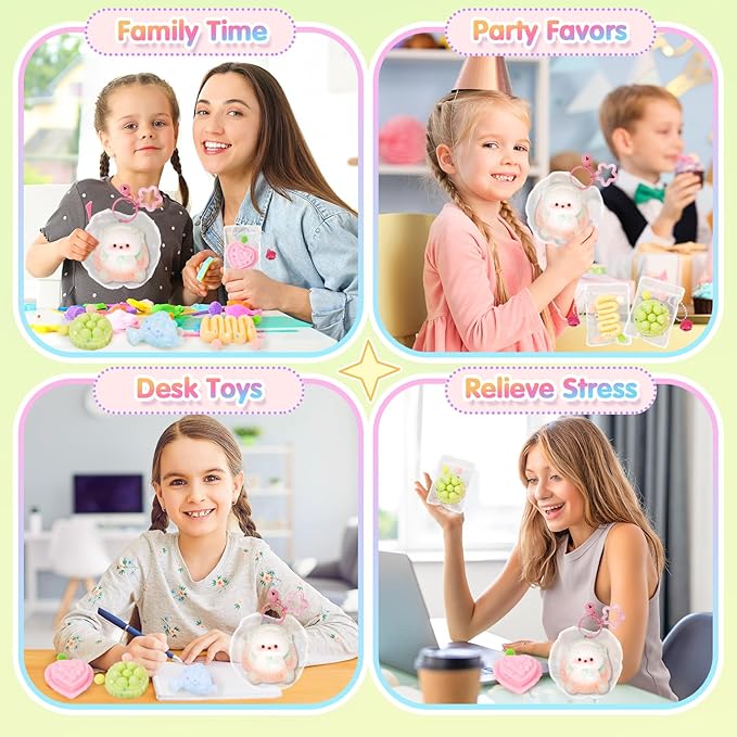 - Versatile Party Favors: The adorable bunny and various small pretend play squeeze toys are perfect for birthday celebrations or parties, relieving stress and adding a touch of cuteness. They also make great party favors or goody bag fillers, ensuring every guest takes home a memorable gift