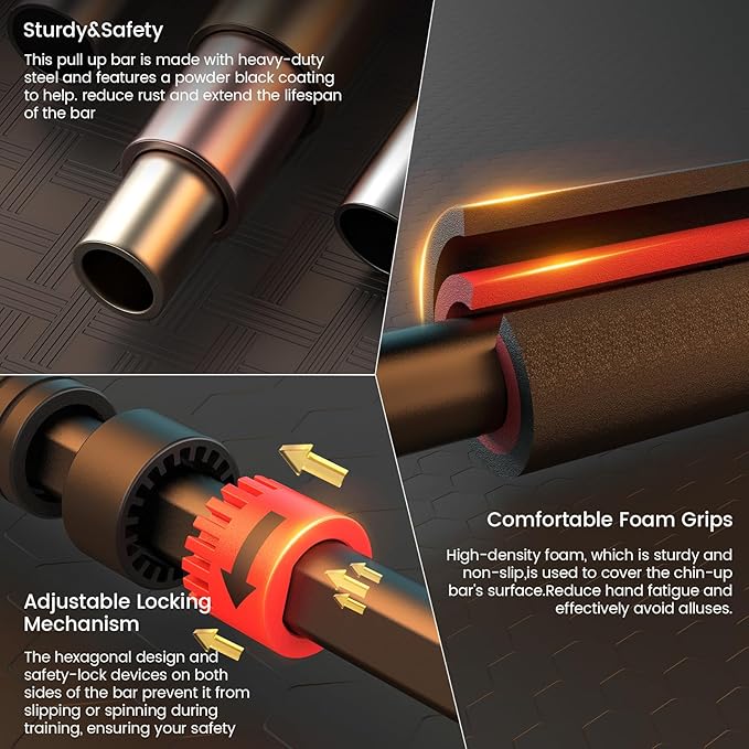 - DOUBLE LOCKING MECHANISM: The door pull up bar has a new 360° rotatable dual gear lock on both ends that protect the bar from loosening and rotating. Once the lock is installed, there will be no more sliding.
