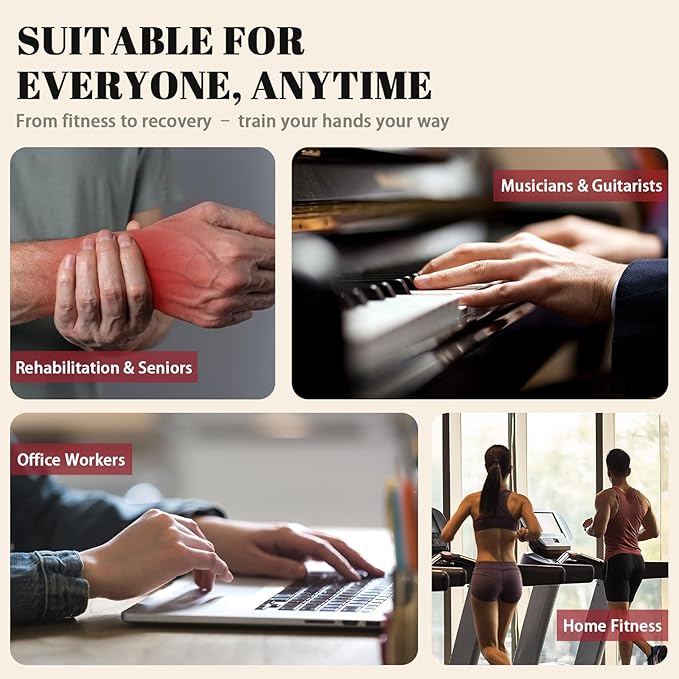 - Targeted Multi-Angle Hand Training: Finger exercisers, stretchers, and grip rings target different muscle groups in your hands, fingers, and forearms. Whether you're rock climbing, lifting weights, playing instruments, or recovering from injury, this set helps improve grip, dexterity, and endurance. While doubling as a stress relief tool.