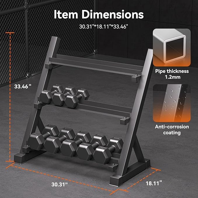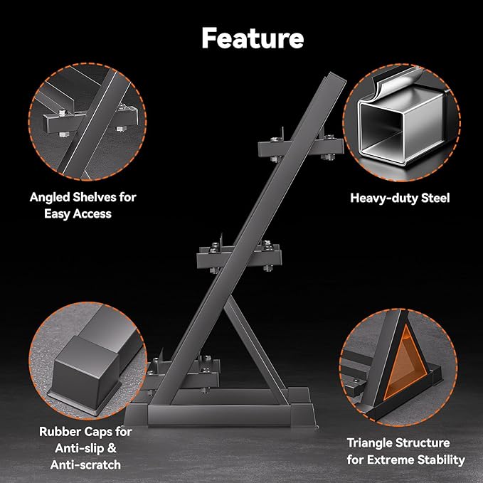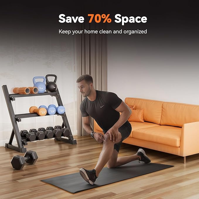 - Space-Saving Design: The 3-tier ergonomic design with angled shelves maximizes storage while ensuring easy access to dumbbells. Fits conveniently in home or gym spaces.