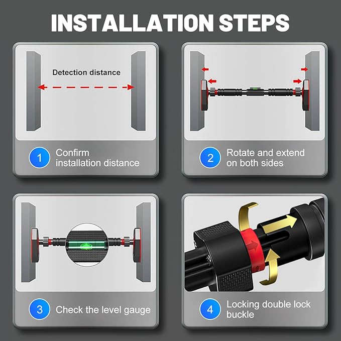 - Easy to Install and Use: Doorway pull up bar is easy to install and remove. It is simple and convenient to use and not require punching. At the same time, door frame pull-up bar comes with a safety locking and level gauge function, which can be firmly fixed