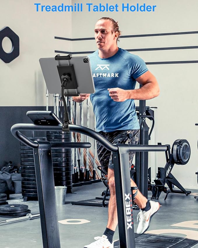 - [Flexible Gooseneck] The treamill tablet holder features a flexible gooseneck arm that allows you to easily adjust your tablet to the perfect viewing angle, enhancing your workout experience on the treadmill