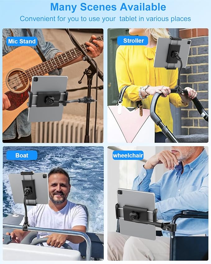 - [Adjustable Clamp] Our gym tablet holder features adjustable clamps that fit handlebars, poles, and tubes with diameters ranging from 0.63'' to 1.5'', making it perfect for strollers, treadmills, elliptical machines, spin bikes, shopping carts, wheelchairs, mic stands, and more