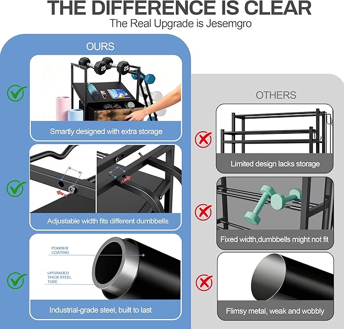 - 【Rock-Solid Load Bearing】With widened joints and a thickened base, this weight rack for home gym dumbbells can hold up to 500 lbs of static load—outperforming standard racks. It includes adjustable anti-slip feet to ensure balance and safety. This makes it not only a strong weight holder, but also a secure solution for families with kids or pets using shared home gym storage areas.