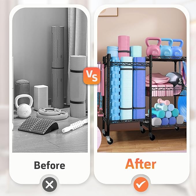 - 【360° Locking Wheels & Removable Hooks】The yoga mat storage is equipped with 6 smooth-rolling wheels (2 of lockable) which enable effortless relocation and lock. The detachable side hook holder and 4 side hooks hang resistance bands, jump ropes, or towels.