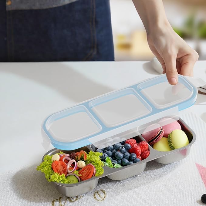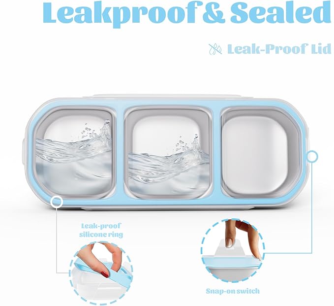 - Leakproof, Locking In Freshness And Flavor: 3 completely independent, sealed compartments keep food separated. Flipping and shaking with zero-leaks means no soggy foods or unpleasant flavors. You can slip the stainless steel snack containers into totes, lunch bags, or backpacks without worrying about spills or squashed snacks