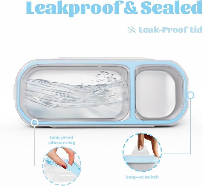 - Leakproof, Locking In Freshness And Flavor: 2 completely independent, sealed compartments keep food separated. Flipping and shaking with zero-leaks means no soggy foods or unpleasant flavors. You can slip the stainless steel snack containers into totes, lunch bags, or backpacks without worrying about spills or squashed snacks