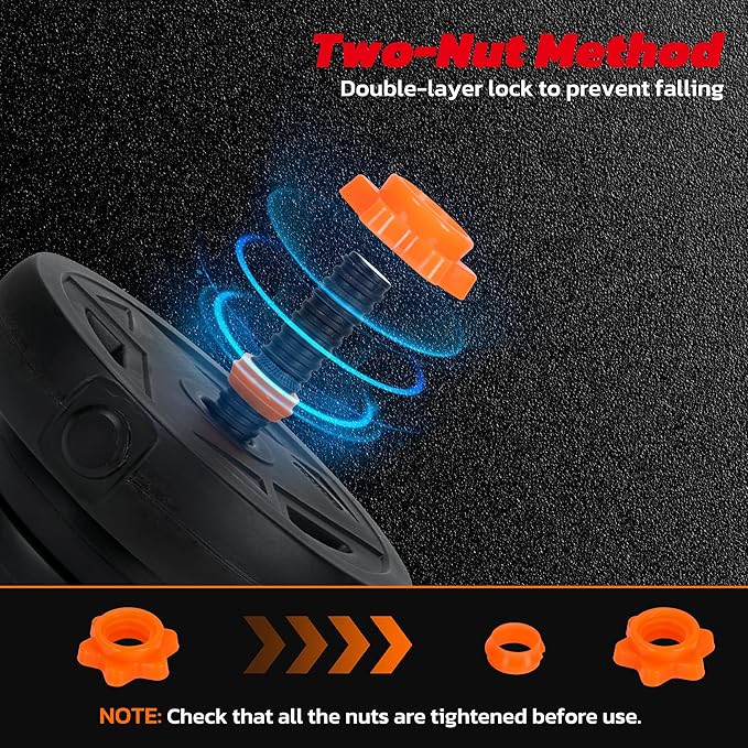 - Secure Double-Lock Nut System: Each adjustable dumbbell set features a two-nut safety locking system that holds weight plates securely in place during training. The added tightening ring of the dumbbell set prevents unwanted shifting, while the screw-threaded bar ensures consistent performance. This system offers secure plate retention when using adjustable dumbbells, especially during dynamic movements or higher reps