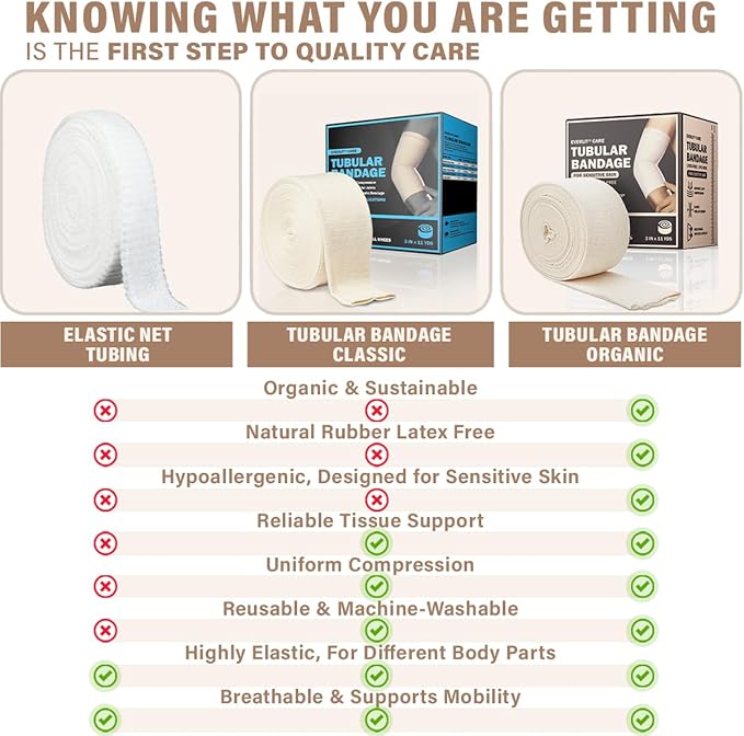 - ✅UNIFORM GENTLE COMPRESSION- The Everlit Care elasticated tubular bandage delivers reliable, gentle, consistent tissue support with a broad variety of uses. The compression bandage delivers adjustable pressure, and can be used as cotton stockinette compression bandage for sprains, strains and other injuries, as knee support/brace, cast padding, and knee wrap, or as compression bandage socks and tubing.
