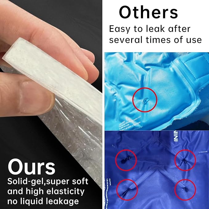 - [No Liquid Leakage] Compared to regular knee ice packs, this new updated solid-gel ice pack avoids liquids leakage problems and have longer service life than regular ice packs.