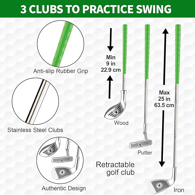 - Retractable Kid-Sized Clubs: Our toddler golf set comes with retractable clubs (iron, wood, putter). Composed of stainless steel shaft and plastic club head, our lightweight and moderate length toddler golf clubs is convenient for kids aged 3-6 to use