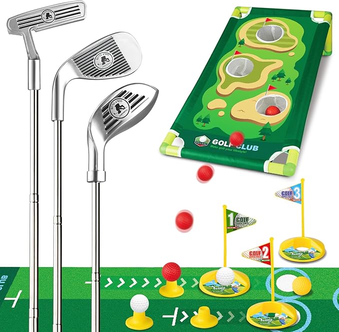 - Complete Golf Gift Set: Vokofaye golf game set includes 3 retractable kids golf clubs 3-5, 9 balls, 1 putting mat, 1 cornhole board, 3 holes and 3 tees, providing everything your little golfer needs. An ideal gift for birthdays, holidays or special occasions