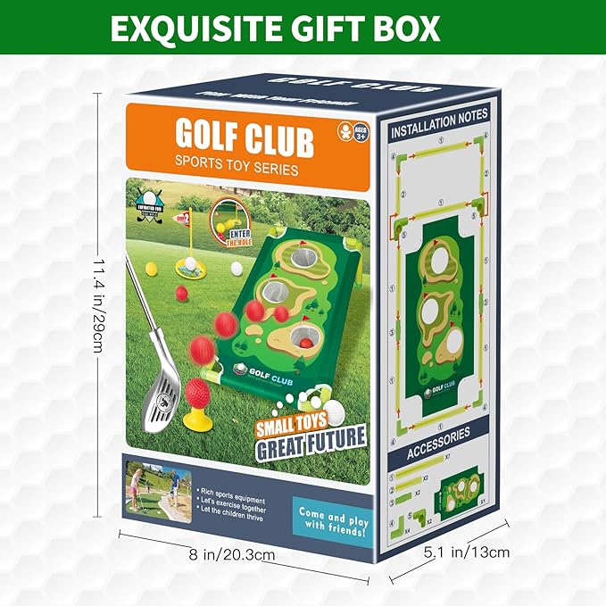 - Multiple Play: Our kids golf club set offer diverse play modes. Using putting mat for practicing putting rhythm according to trajectories, and cornhole board for aiming and shooting. Beginners can get started easily, while advanced players can enjoy challenge
