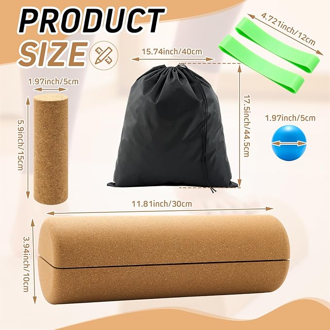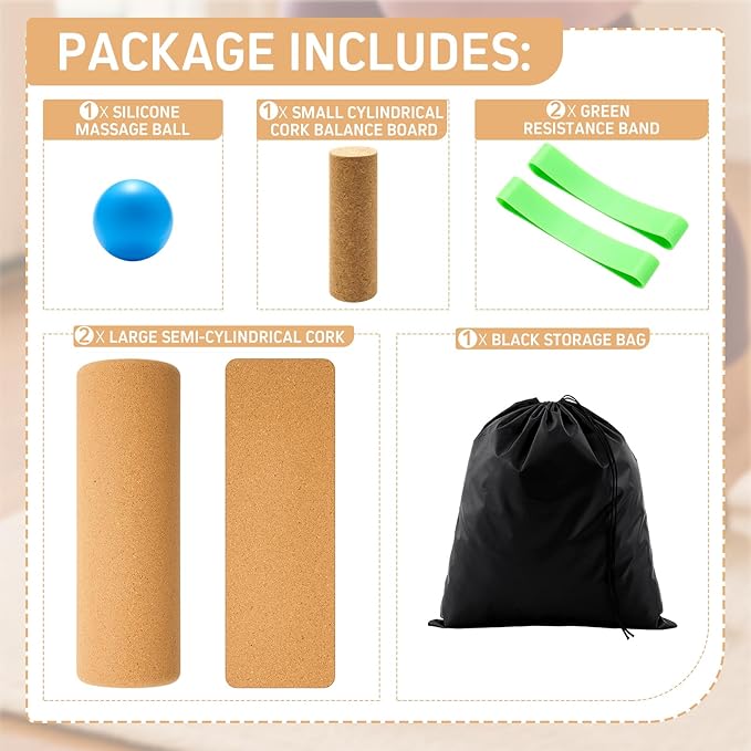 - Balance Trainer Kit: our foot balance cork kit is your all in one solution for foot therapy; It includes 2 sizes half cylinder cork balance boards, 1 foot massage ball, 2 toe resistance bands, and 1 drawstring bag; Achieve holistic recovery and foot arch strength with our expertly crafted tools in one convenient package