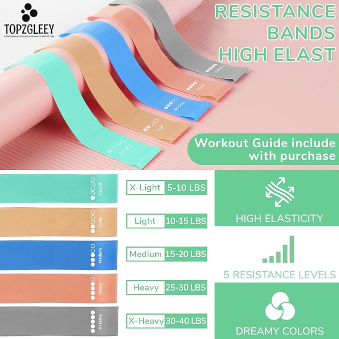 - Multiple Uses High End Exercise Bands; This Resistance Band Set Can Be Integrated Seamlessly With Various Popular Workout Program. Or Use Them For General Exercise, Stretching, Strength Training,Power Weight,More than just a dreamy design, these highly durable latex bands featuring 5 TPE material bands covering five resistance levels from X-Light to X-Heavy (5lbs to 40lbs )for versatile exercises tailored to all fitness levels resistance levels, the perfect addition to Pilates workout.