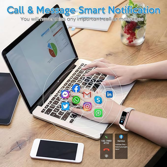- 【Real time calling and message notifications】You can receive buzzing notifications of incoming calls, text messages, and application messages on your wrist,including Facebook,Instagram,Twitter,TikTok,WhatsApp, Messenger, etc.You can check the names or numbers of callers on your smartwatch to decide whether to answer or make a call. You can read SMS and app messages directly on your watch. With notifications and call alerts, it keeps you connected and supports a healthier lifestyle.
