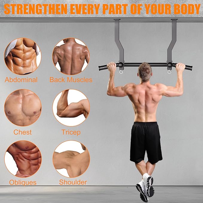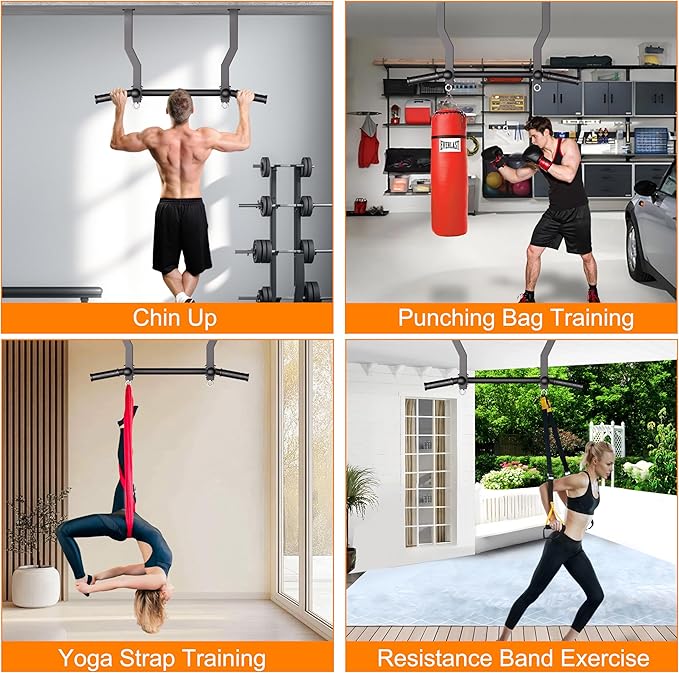 - 【MULTI FUNCTION ANCHOR】Our rafter pull up bar features two anchors for installing additional training accessories: TRX straps, resistance bands, sandbags, yoga straps, and power ropes, catering to diverse fitness needs.