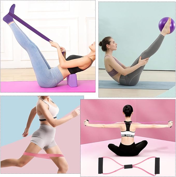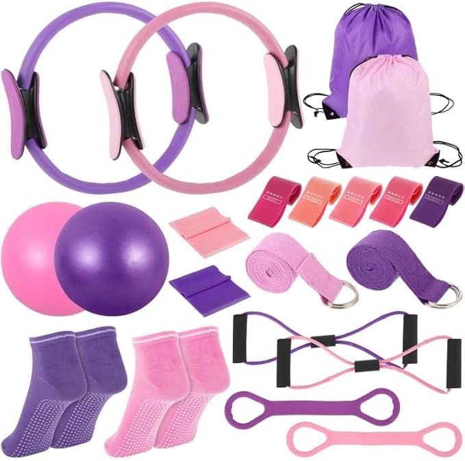- Versatile Fitness Equipment Set: This Pilates ring set includes two Pilates rings, two Pilates balls, two yoga straps, five yoga resistance bands, two stretching straps, two resistance tubes, two 8-piece resistance bands, two pairs of non-slip socks, and two gym bags. This thoughtful and complete set can meet diverse workout needs. The purple and pink sets of Pilates equipment can be shared with close friends for a fun workout.