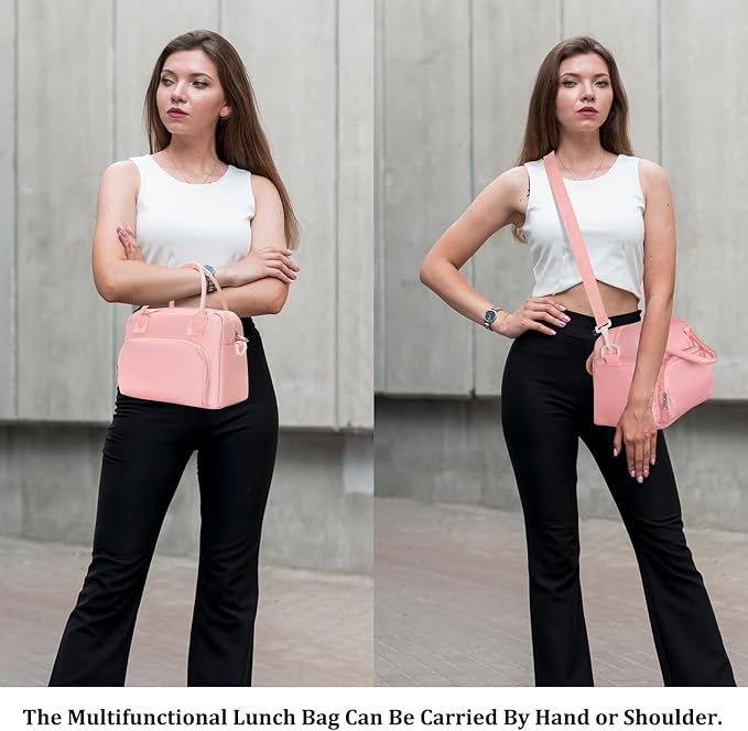 - POTABLE & REMOVABLE SHOULDER STRAP - The reusable lunch box features a durable handle and is equipped with a detachable and adjustable shoulder strap (adjust from 23" to 43"), which provides three carrying ways: shoulder bag, cross-body bag or chic handbag. Ideal to be used as daily lunch bag, sundries bag, refrigerated bag, shopping bag, picnic bag and make up bag for office, work, school, hiking trail, leisurely picnic, camping, or gym, etc