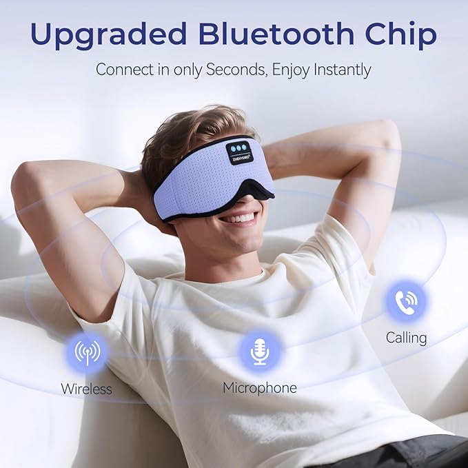 - Upgraded Bluetooth 5.4 Chip, Reliable Connection: Our wireless Bluetooth sleep headphones are equipped with an advanced Bluetooth 5.4 chip, featuring fast pairing and a reliable signal within a range of 15 meters. This Bluetooth eye mask is compatible with most Bluetooth devices, ensuring uninterrupted listening while sleeping, meditating, or relaxing—no wires, no hassles.