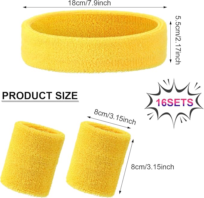 - Package Include: you will receive 16 Sets 80's Headband sweatbands Set, Include 16 pieces headbands and 16 pairs of tennis wrist sweatbands, 16 sets sufficient for your daily outfit and sports wearing; Or you can share them with your surrounding people