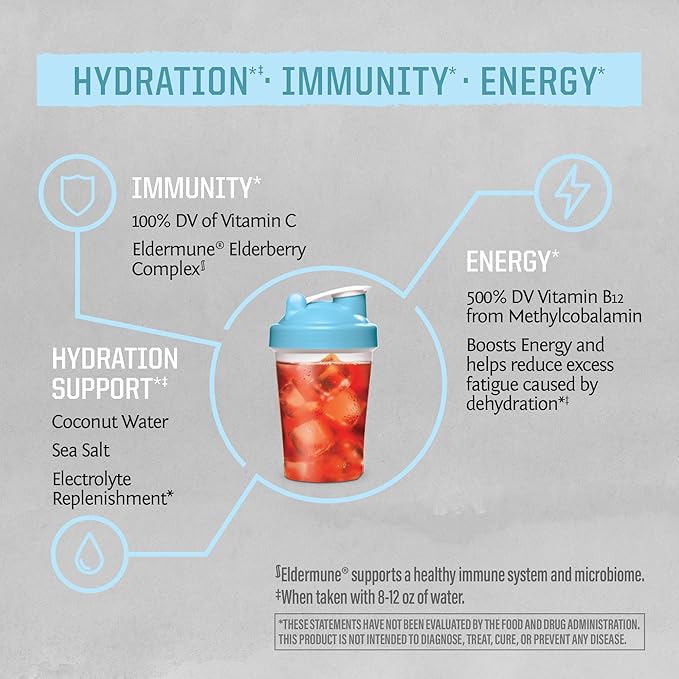 - Benefits: Promotes hydration and boosts energy and helps reduce excess fatigue caused by dehydration. We’ve unlocked the correct ratio that delivers the essentials of hydration, immune support, and energy to help you rehydrate faster so you can soak up every drop of life.
