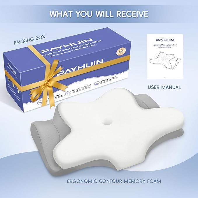 - Unique Ergonomic Contour Design: Crafted with US-patented ergonomic memory foam, our PAYHUIN cervical neck pillow wraps your neck and head in a natural embrace. It fits naturally with neck and head curves, aligns the spine, relieves pressure