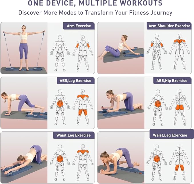 - 【30 Minute Efficient Workouts】This Pilates board features three different configurations that unlock over 15 exercise variations. Combining the functions of a Pilates board, abs roller, resistance band, push-up handles, balance board, and planks. Whether you're a fitness beginner or a Pilates enthusiast, the all-in-one design makes it easy to start your fitness journey at home!