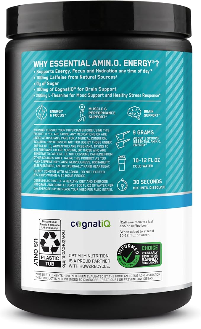 Optimum Nutrition Amino Energy Powder Plus Focus, with BCAA, Electrolytes, and Caffeine, Tropical Lemonade, 30 Servings (Packaging May Vary)