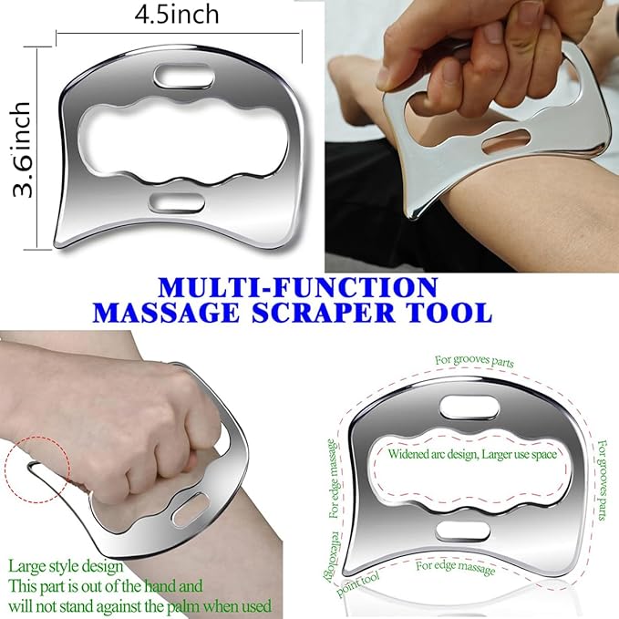 - PROFESSIONAL DESIGN: 5-in-1 stainless steel muscle scraper set featuring different edge shapes and curves for versatile soft tissue massage techniques
